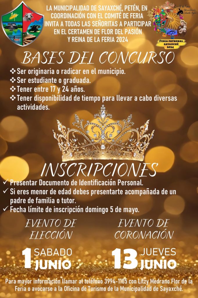 LA MUNICIPALIDAD DE SAYAXCHÉ, PETÉN, EN COORDINACIÓN CON EL COMITÉ DE FERIA INVITA A TODAS LAS SEÑORITAS A PARTICIPAR EN EL CERTAMEN DE FLOR DEL PASIÓN Y REINA DE LA FERIA 2024.