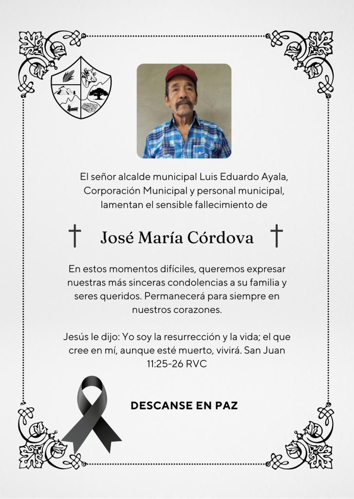 La Municipalidad de Sayaxché, lamenta el sensible fallecimiento de quien en vida fue José María Córdova, expresamos nuestras más sinceras palabras de condolencias a su familiares y amigos.