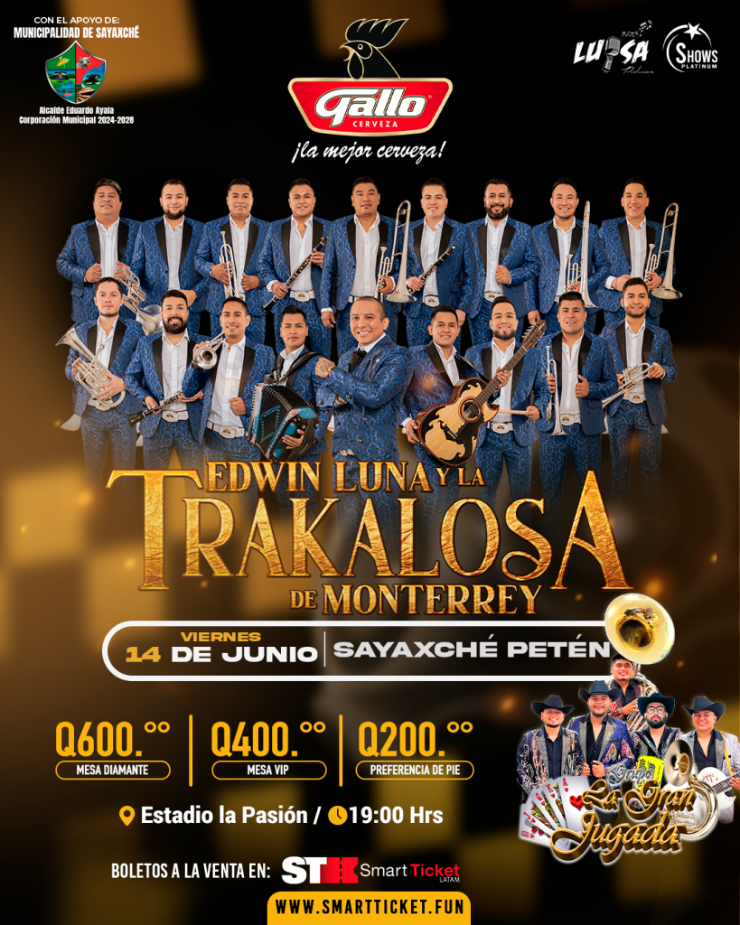 la municipalidad de Sayaxché, anuncia concierto de Edwin Luna y La Trakalosa de Monterrey, en el Estadio La Pasión, este viernes 14 de junio de 2024, en la Feria del municipio, en honor a su Santo Patrono San Antonio de Padua, esto con el apoyo del señor alcalde Eduardo Ayala.